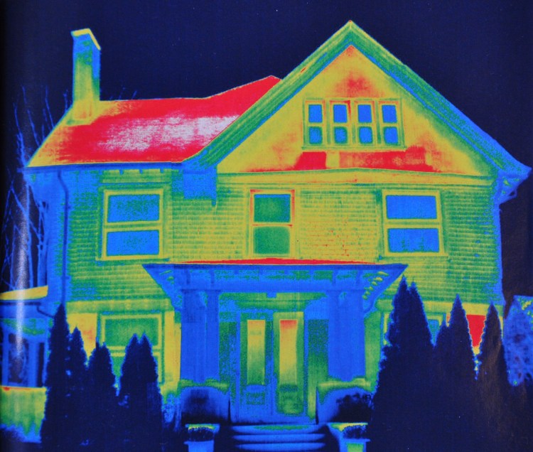 Homes leak energy. This infrared photo shows the heat being lost through a typical home. Yellow and red indicate heat loss. High performance homes endeavor to create a building envelope that greatly reduces heat loss.