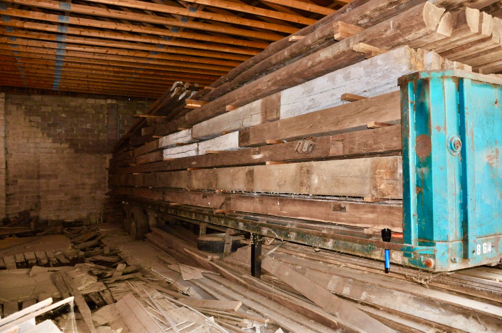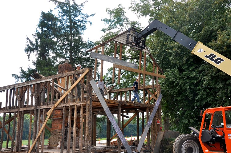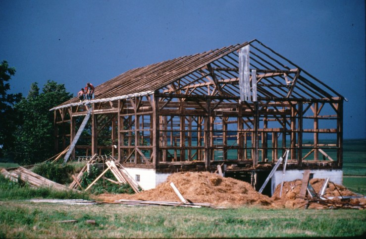 Dismantling the barn frame. Each piece is numbered for reassembly.