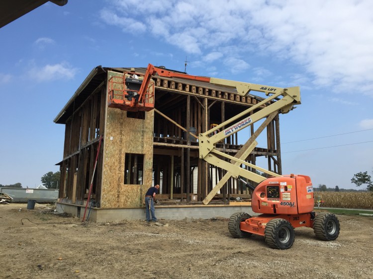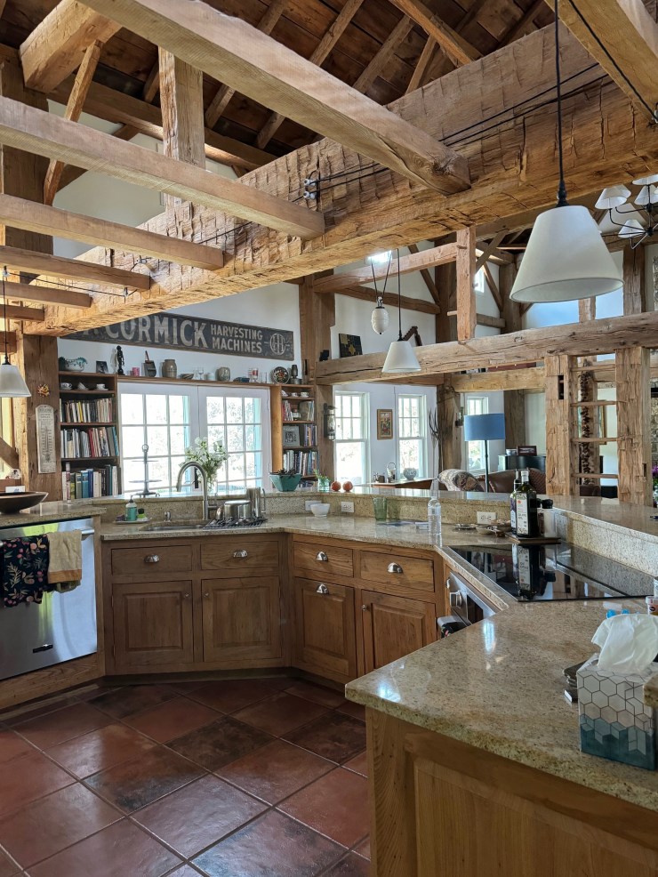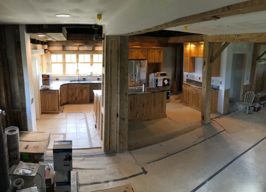 First visit to the family’s 1872 farmhouse in Marion. Having been in the family for generations the new owners, upon learning that the home was timber framed, wished to restore it for their growing family. The house was jacked up and a new concrete foundation replaced the old stone walls. Everything was striped down to the original frame which was then thoroughly cleaned. SIPS (Structural Insulated Panels) were applied to the exterior followed by a complete renovation of the homes interior.