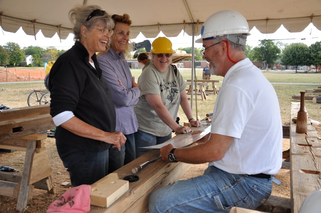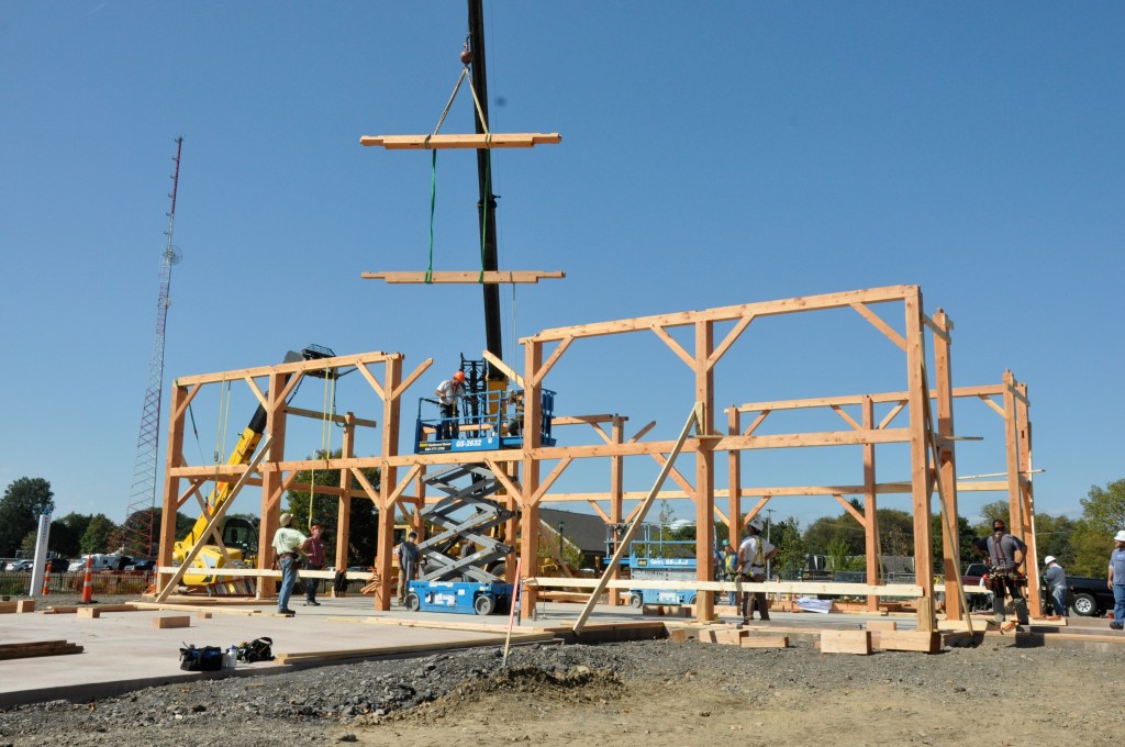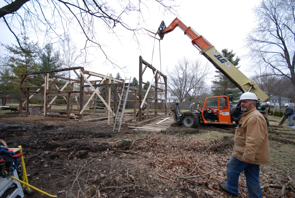 Raising the restored frame with volunteers including those from Friends of Ohio Barns and The Timber Framers Guild. The Guild often invited eager to learn students from nearby Greensview Elementary to the site to teach them about timber framing.