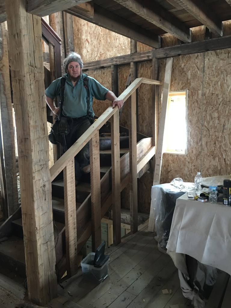After lifting the house, installing its new foundation and pressure washing all of its hewn timbers, we removed all of the old siding and installed new SIPS.