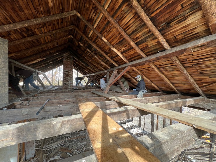 These beautiful hand hewn ceiling joists will be exposed from the first floor kitchen/dining area upon restoration.