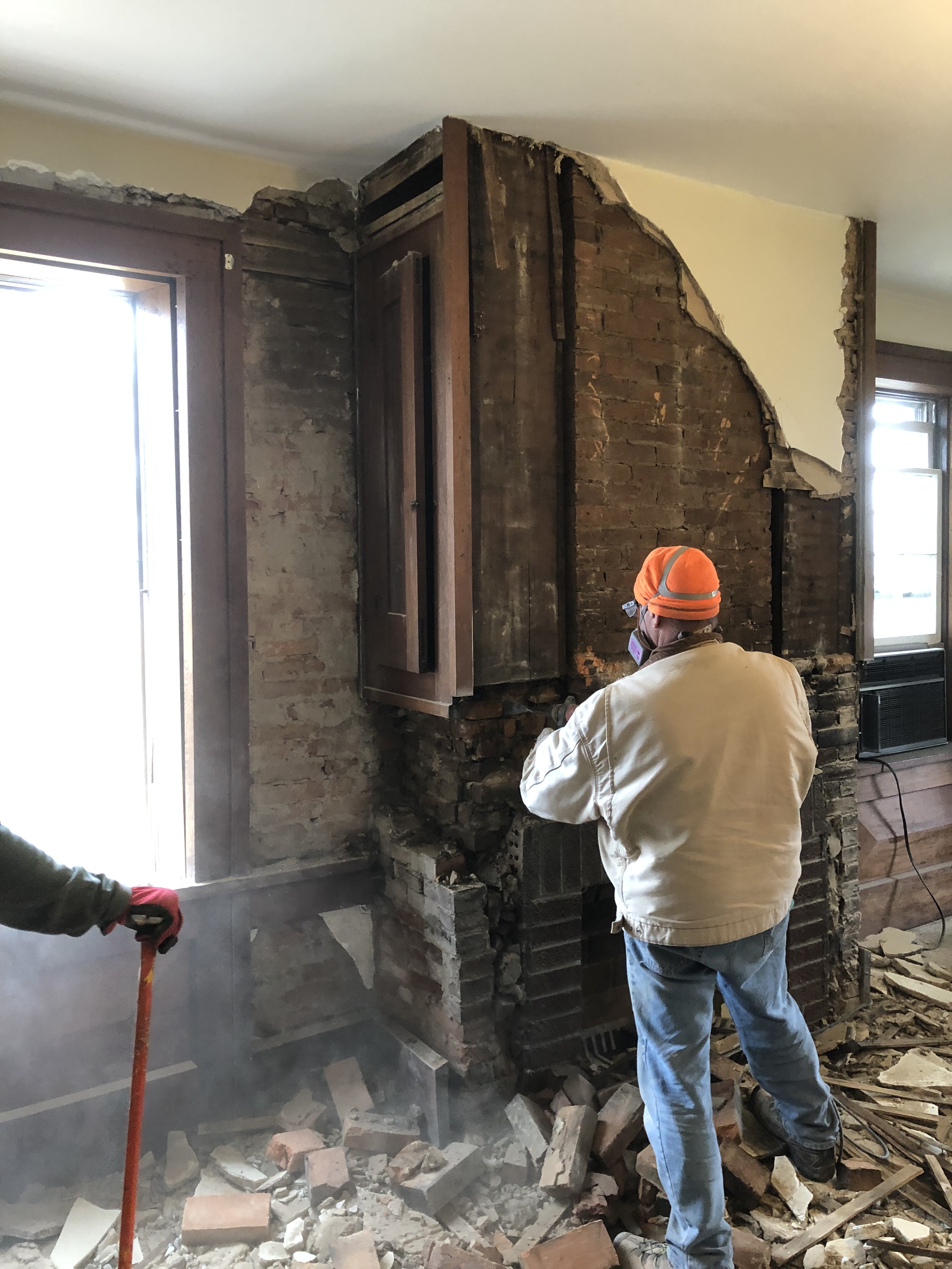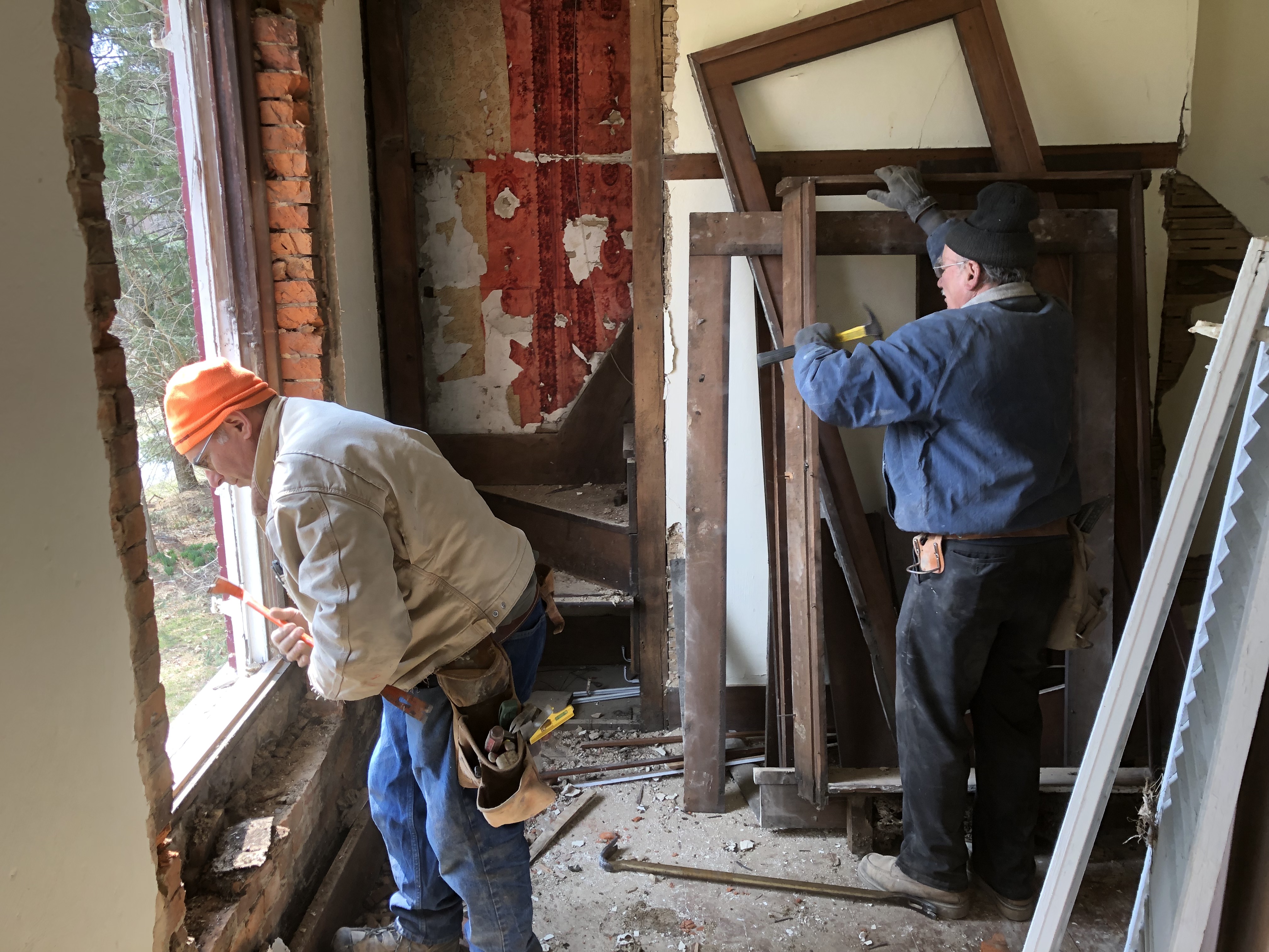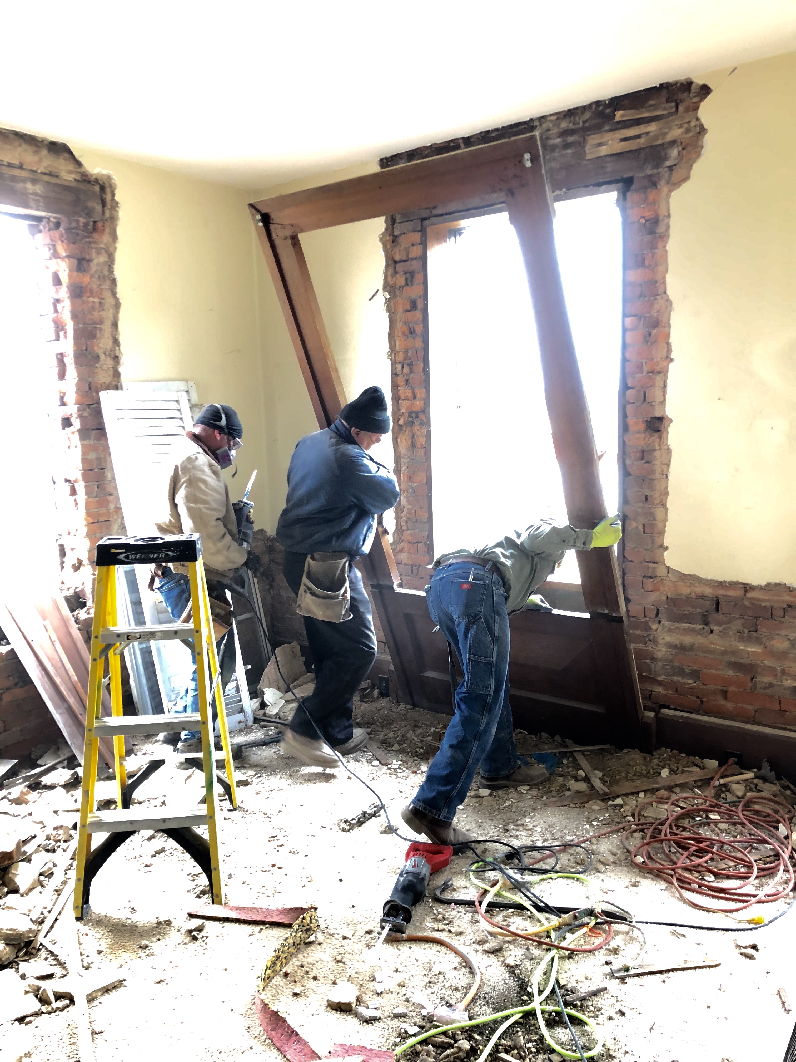 This brick home was slated for demolition and the owners kindly offered us the opportunity to save all of its interior walnut doors and trim knowing that it could be put to good use. Our crew takes a minute for a quick photo op.