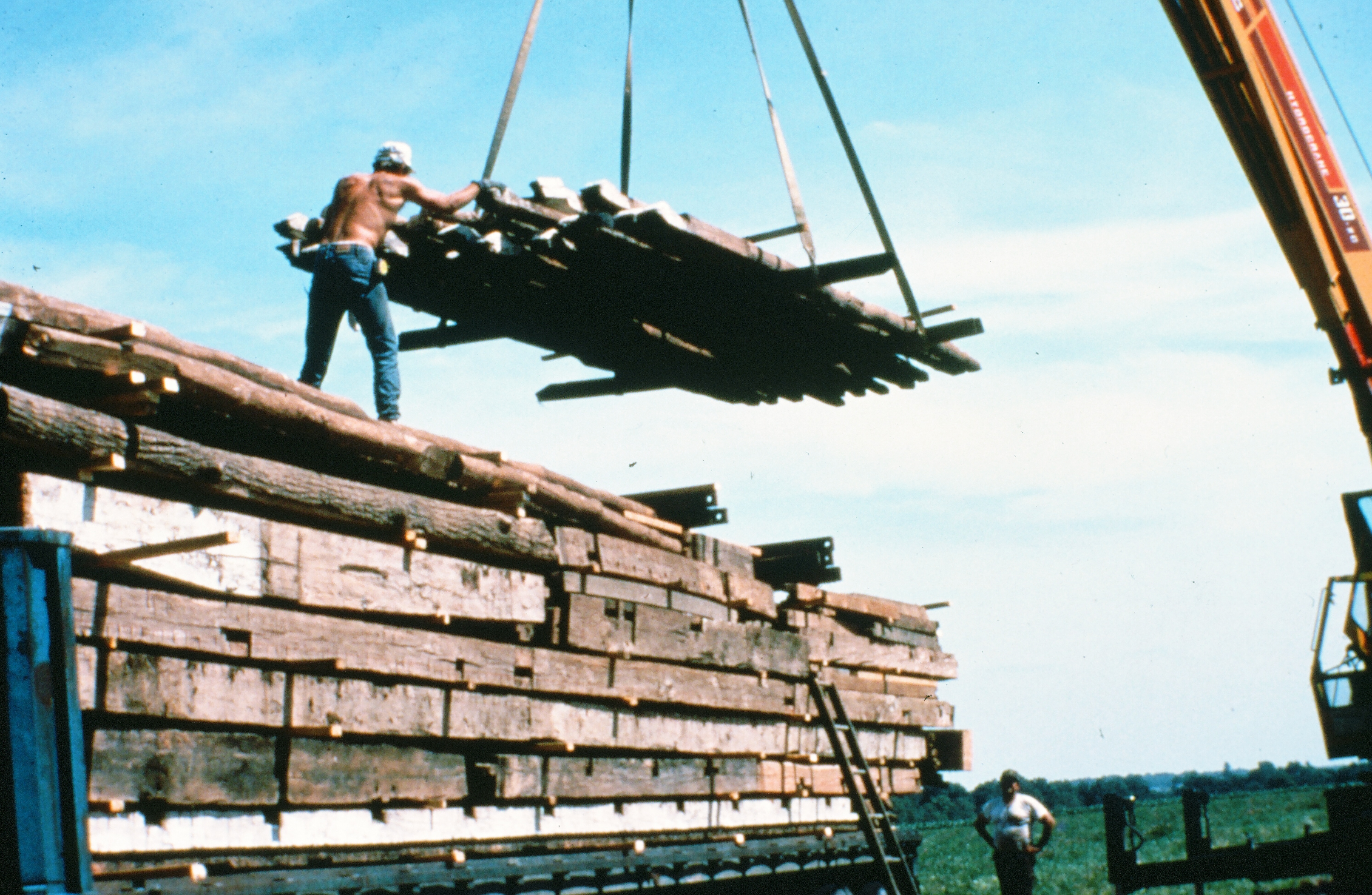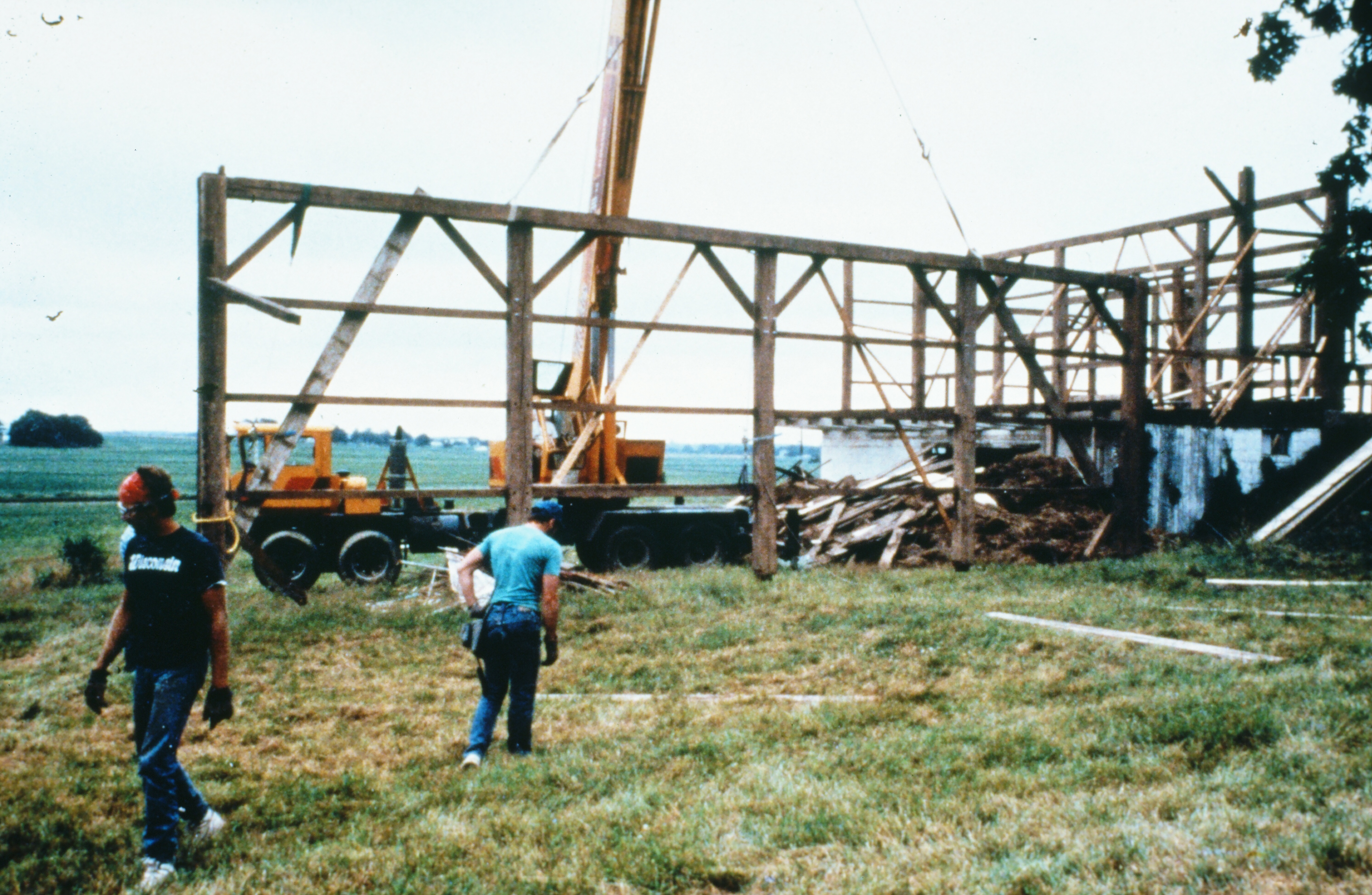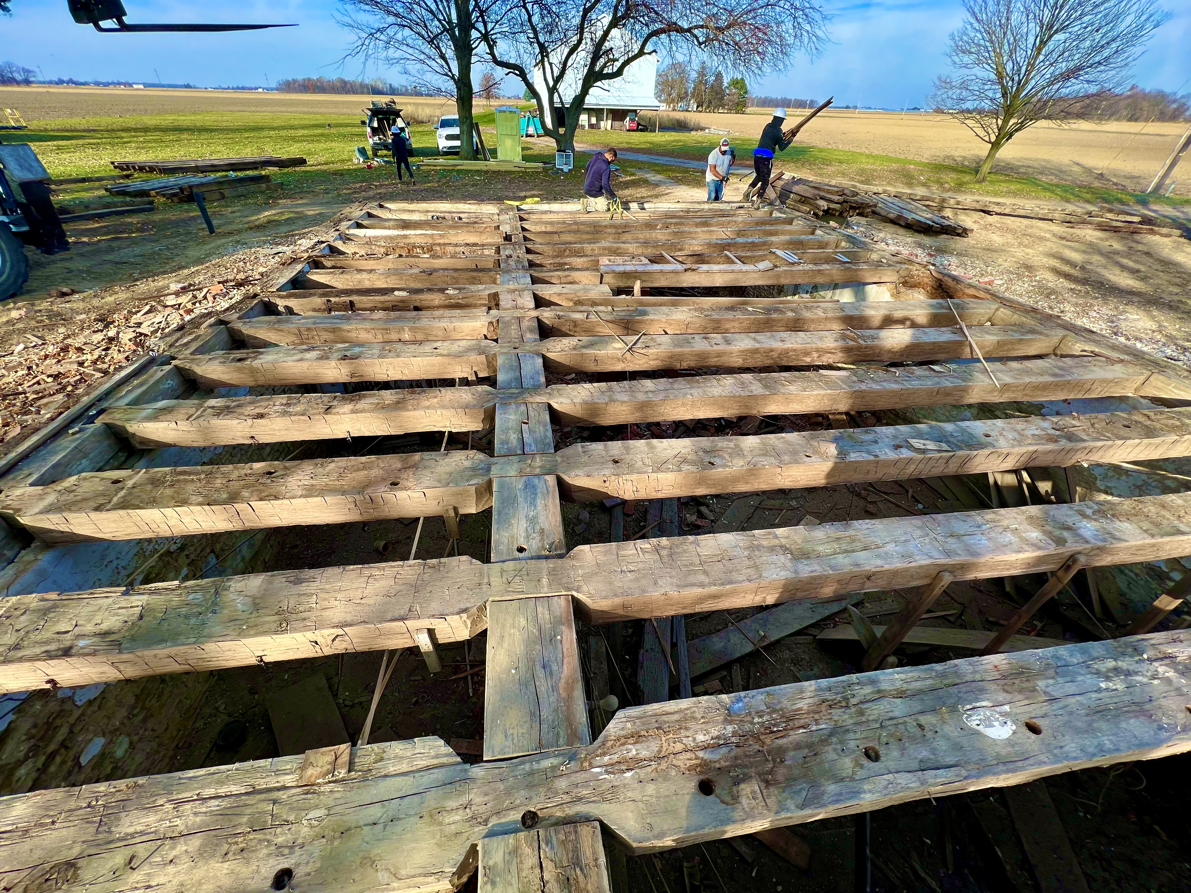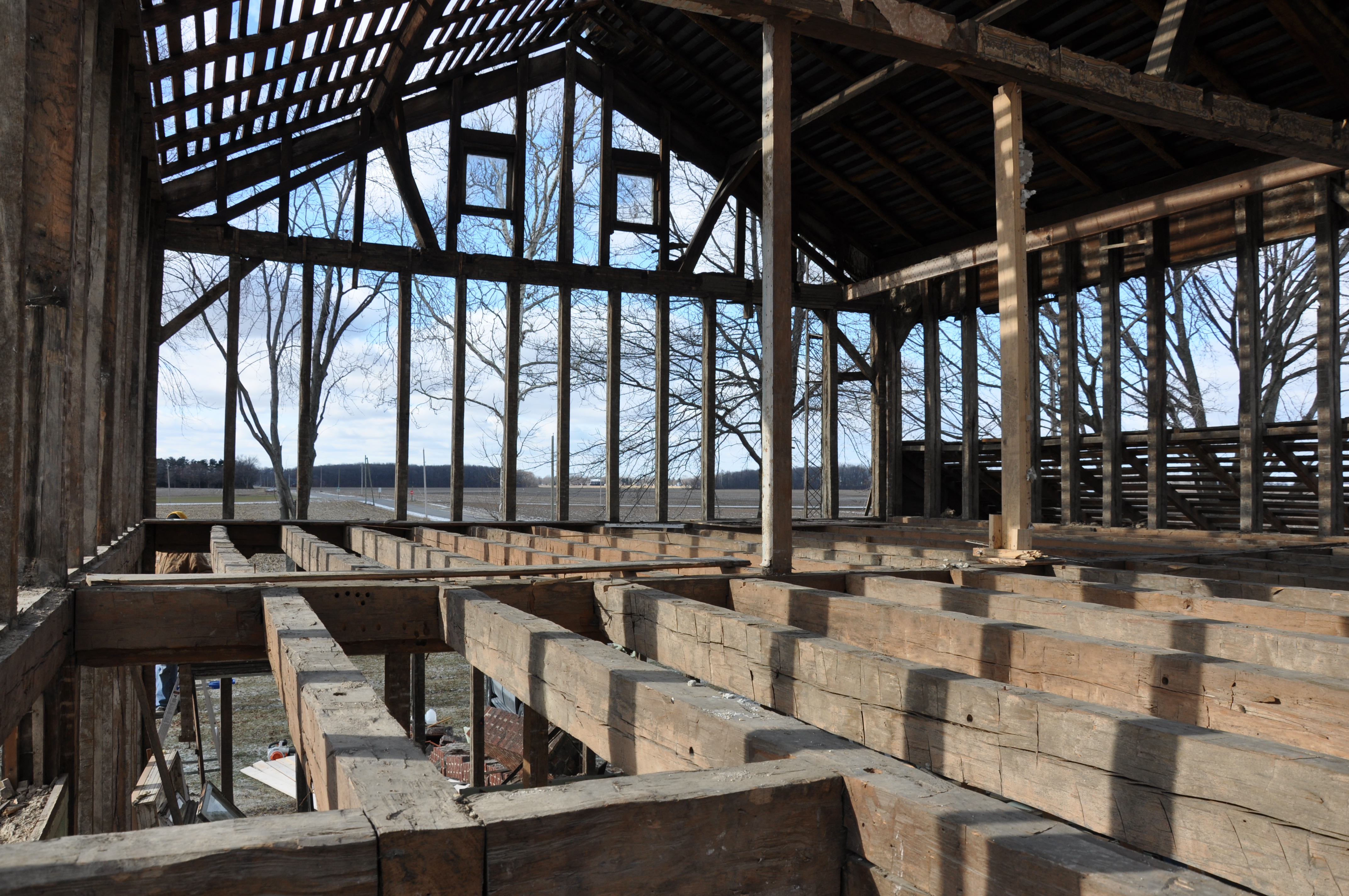 Dismantling the barn frame. Each piece is numbered for reassembly.