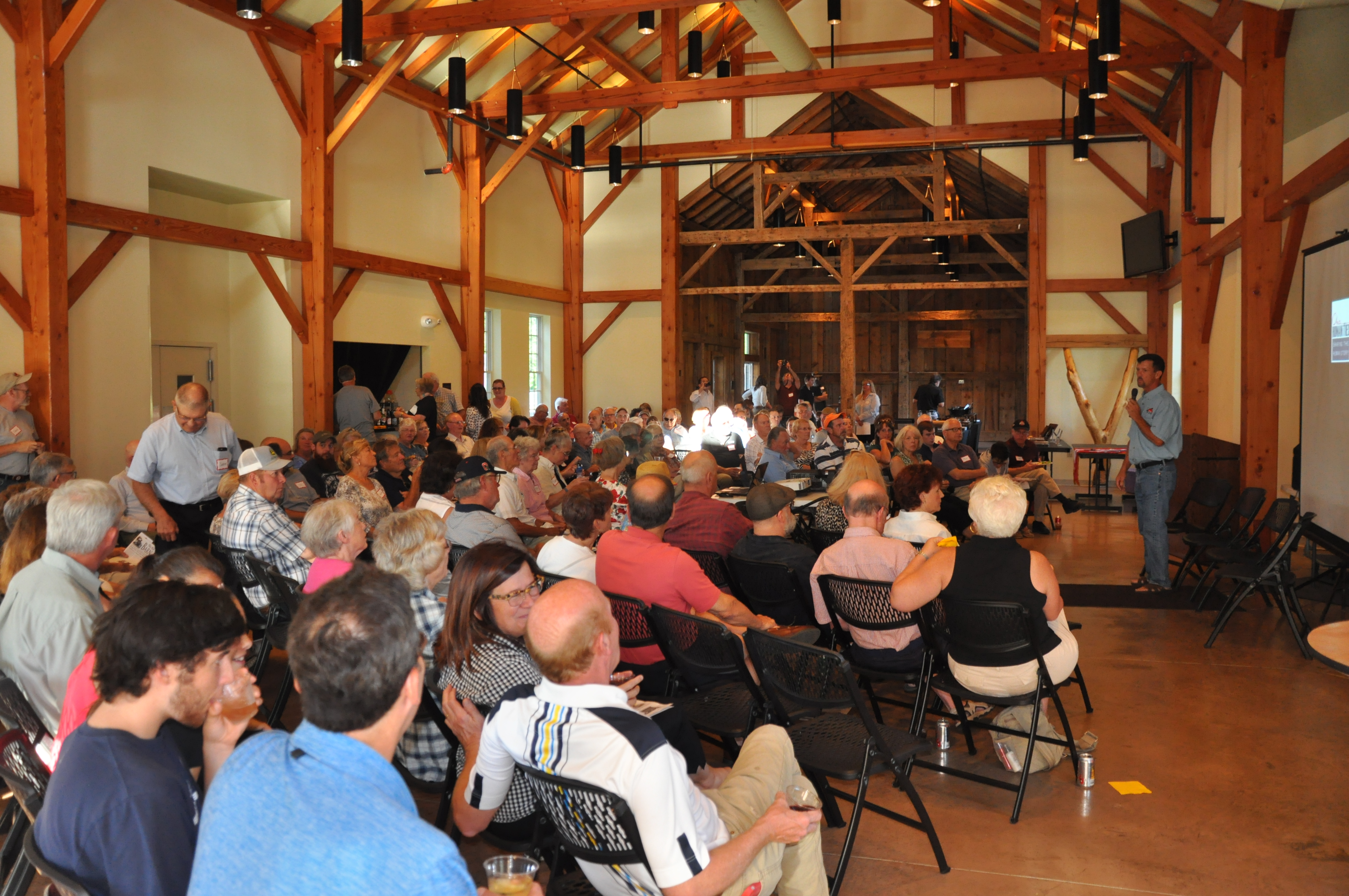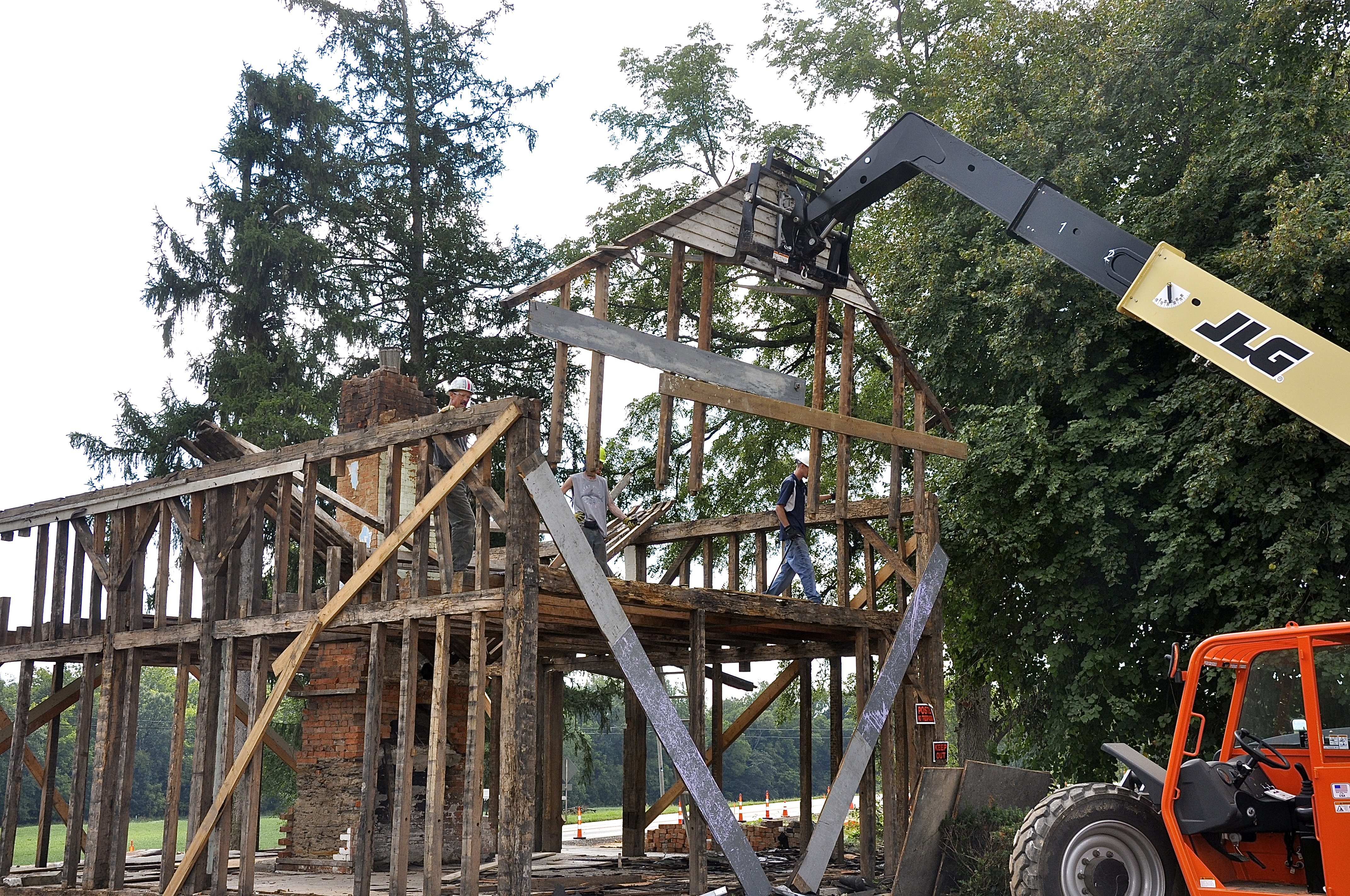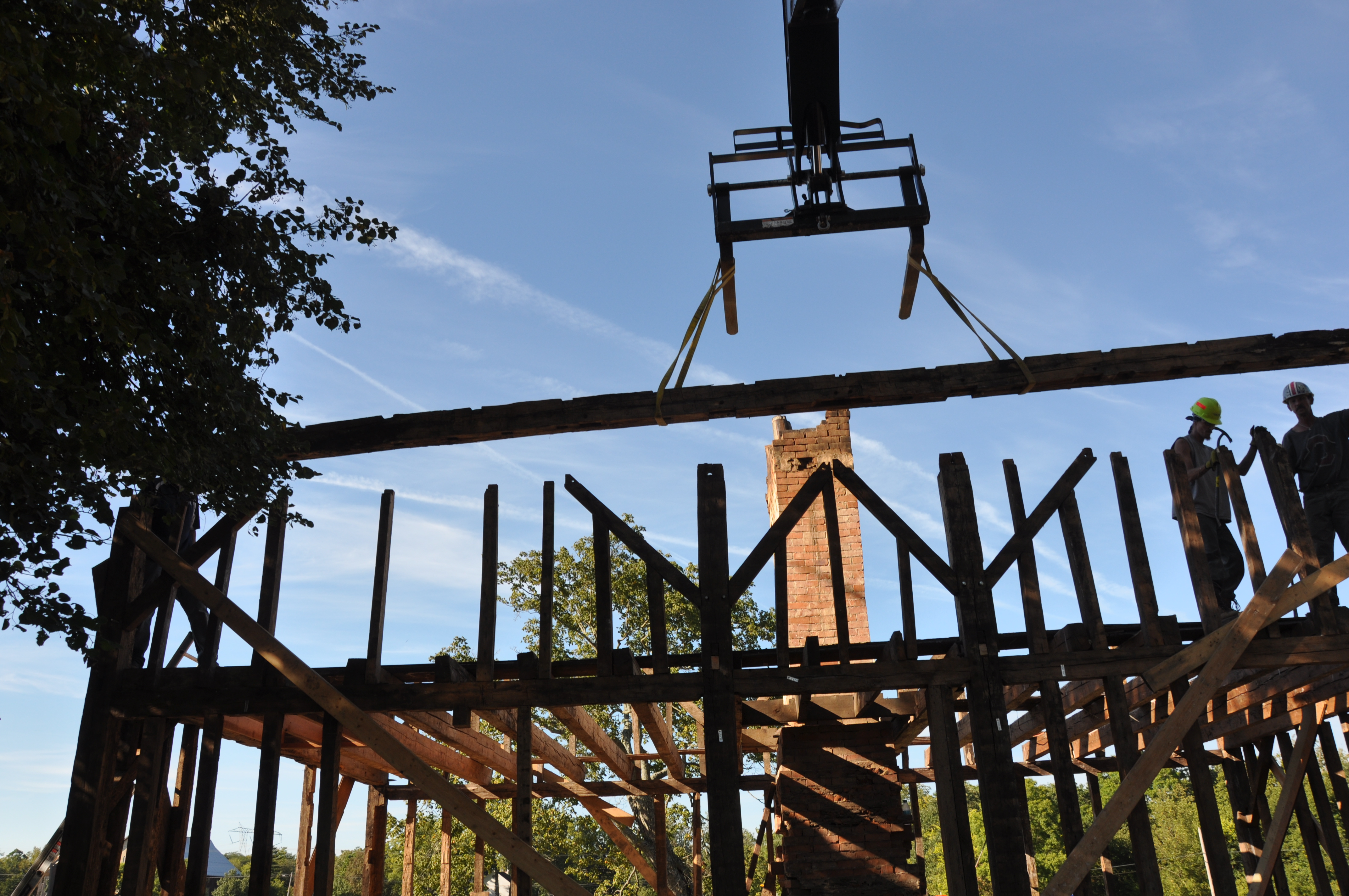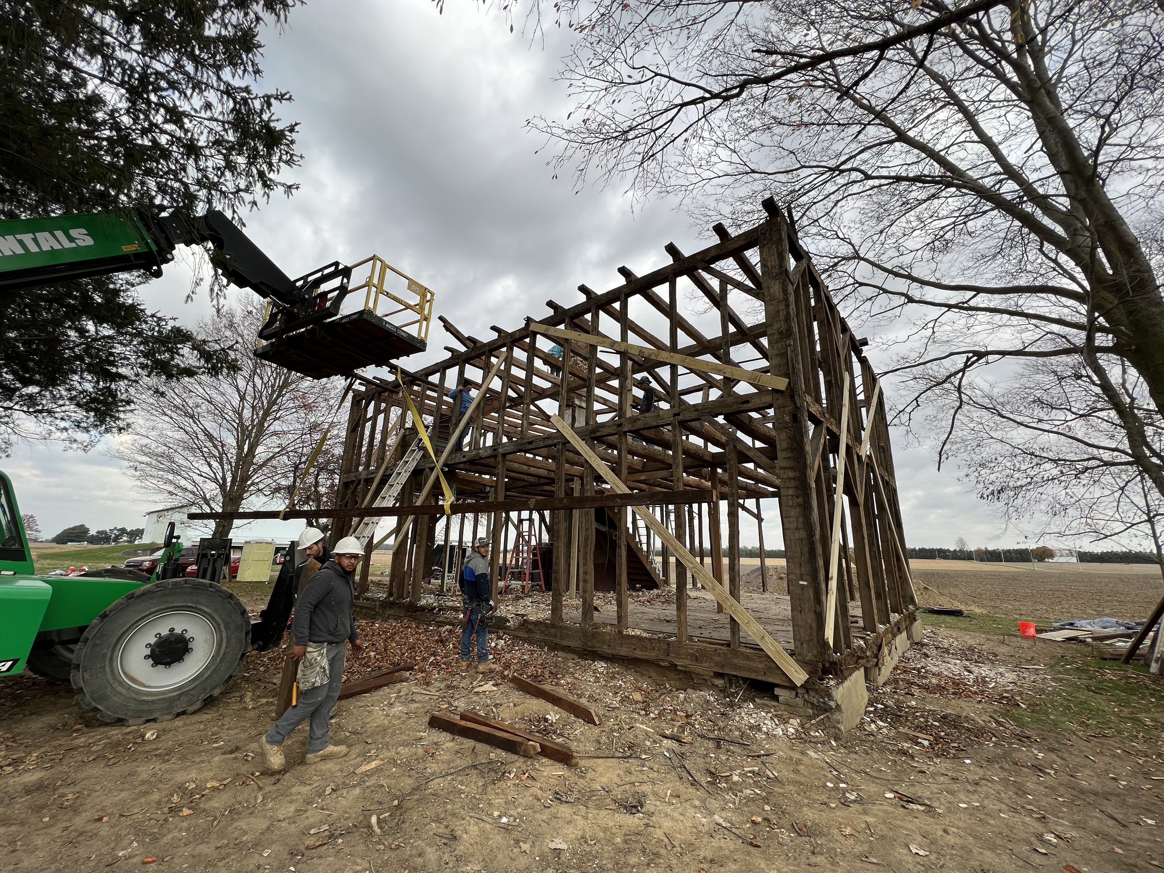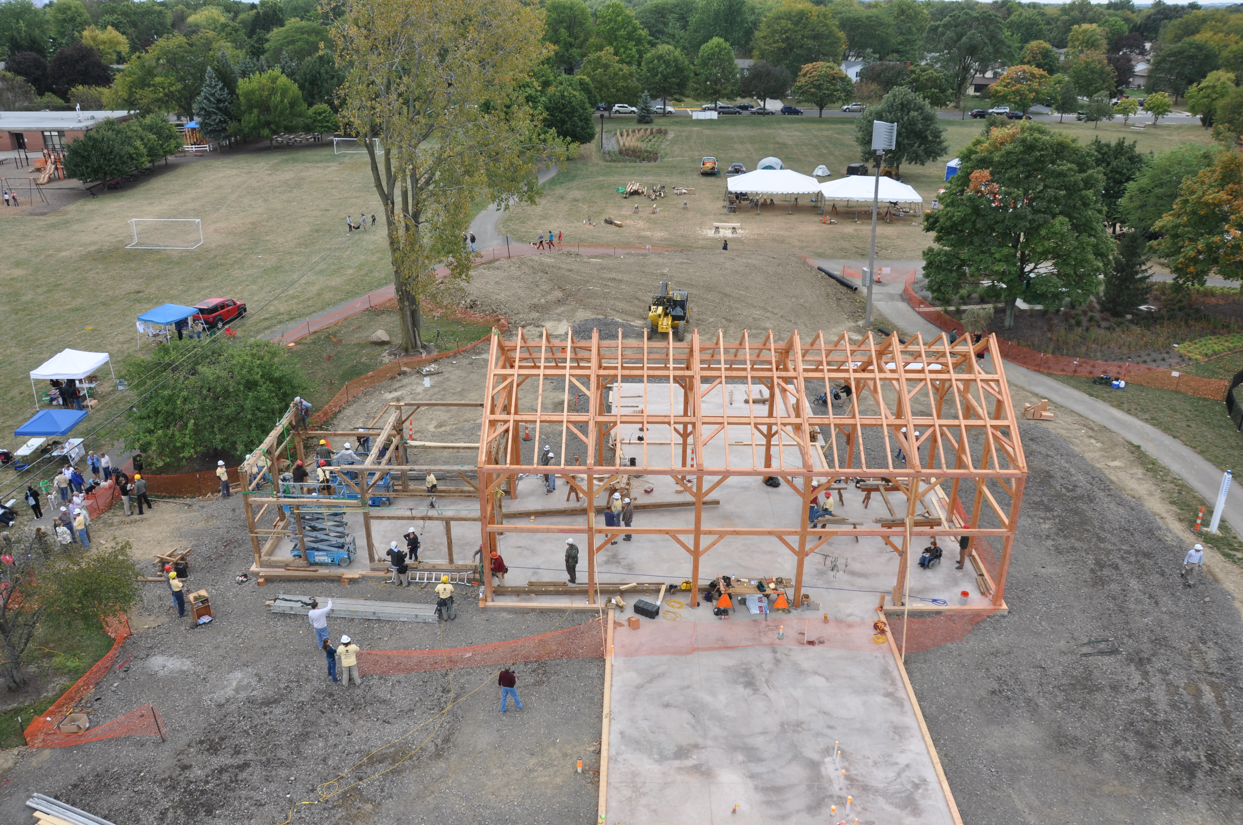 Raising the restored frame with volunteers including those from Friends of Ohio Barns and The Timber Framers Guild. The Guild often invited eager to learn students from nearby Greensview Elementary to the site to teach them about timber framing.