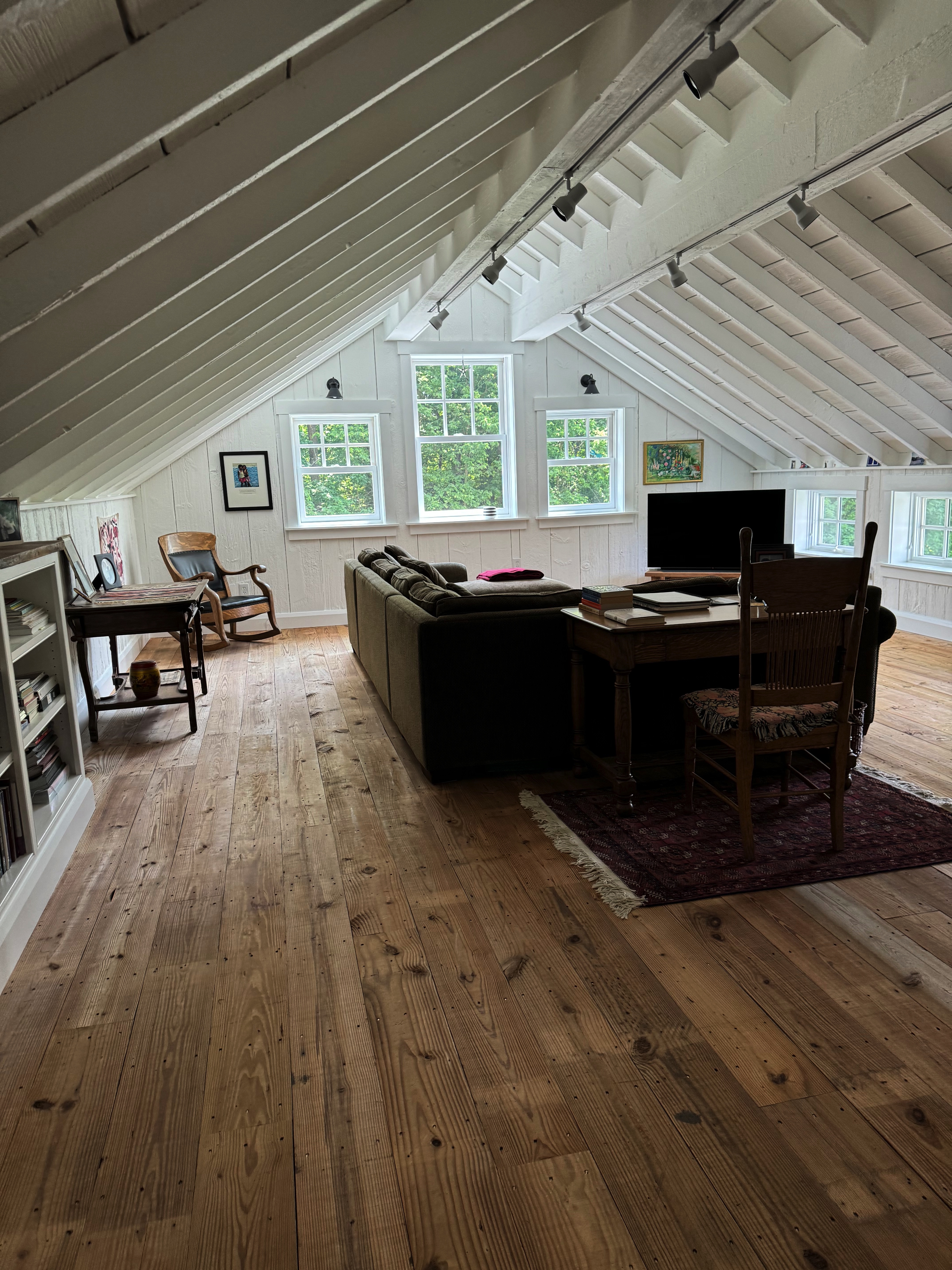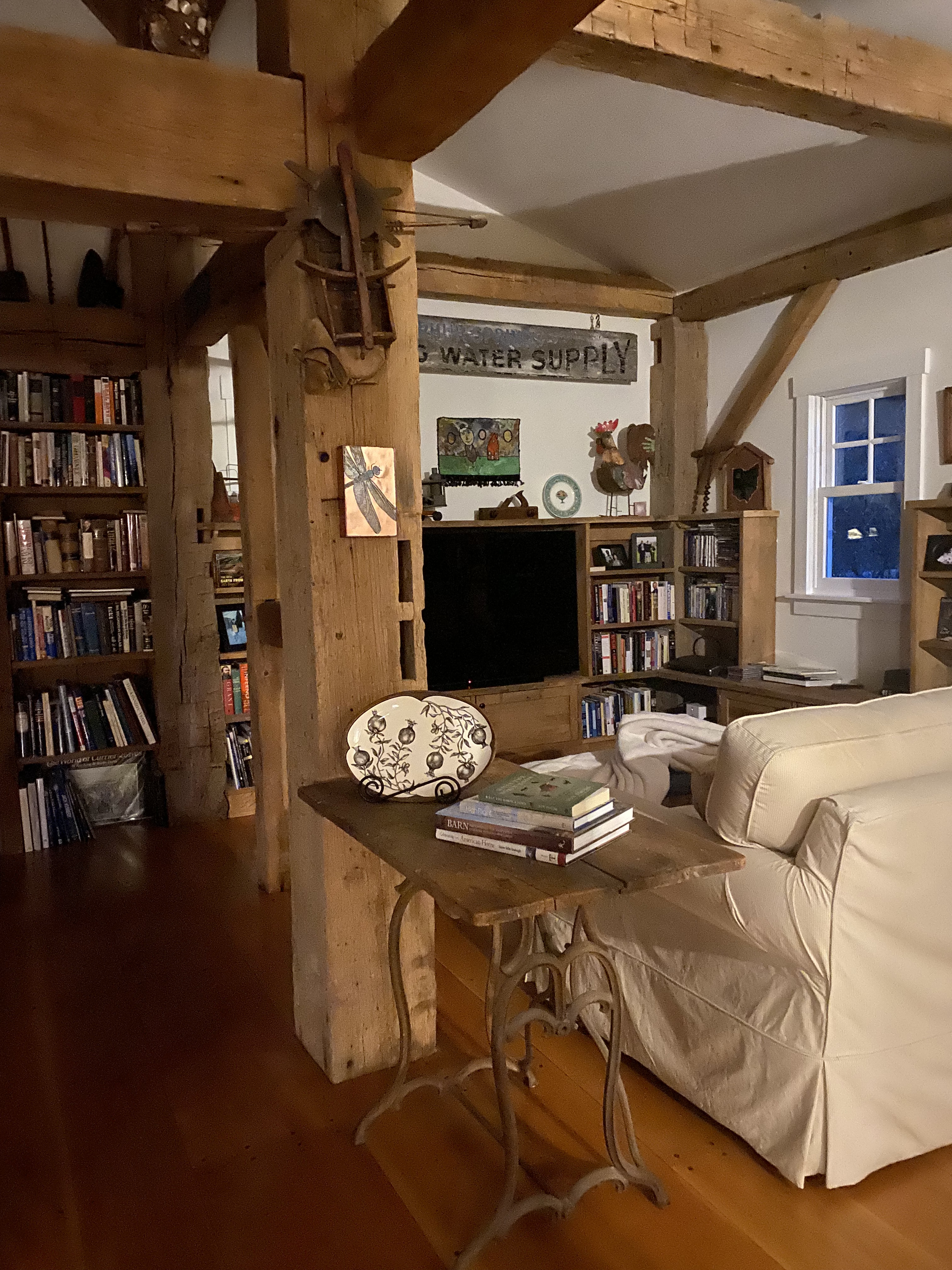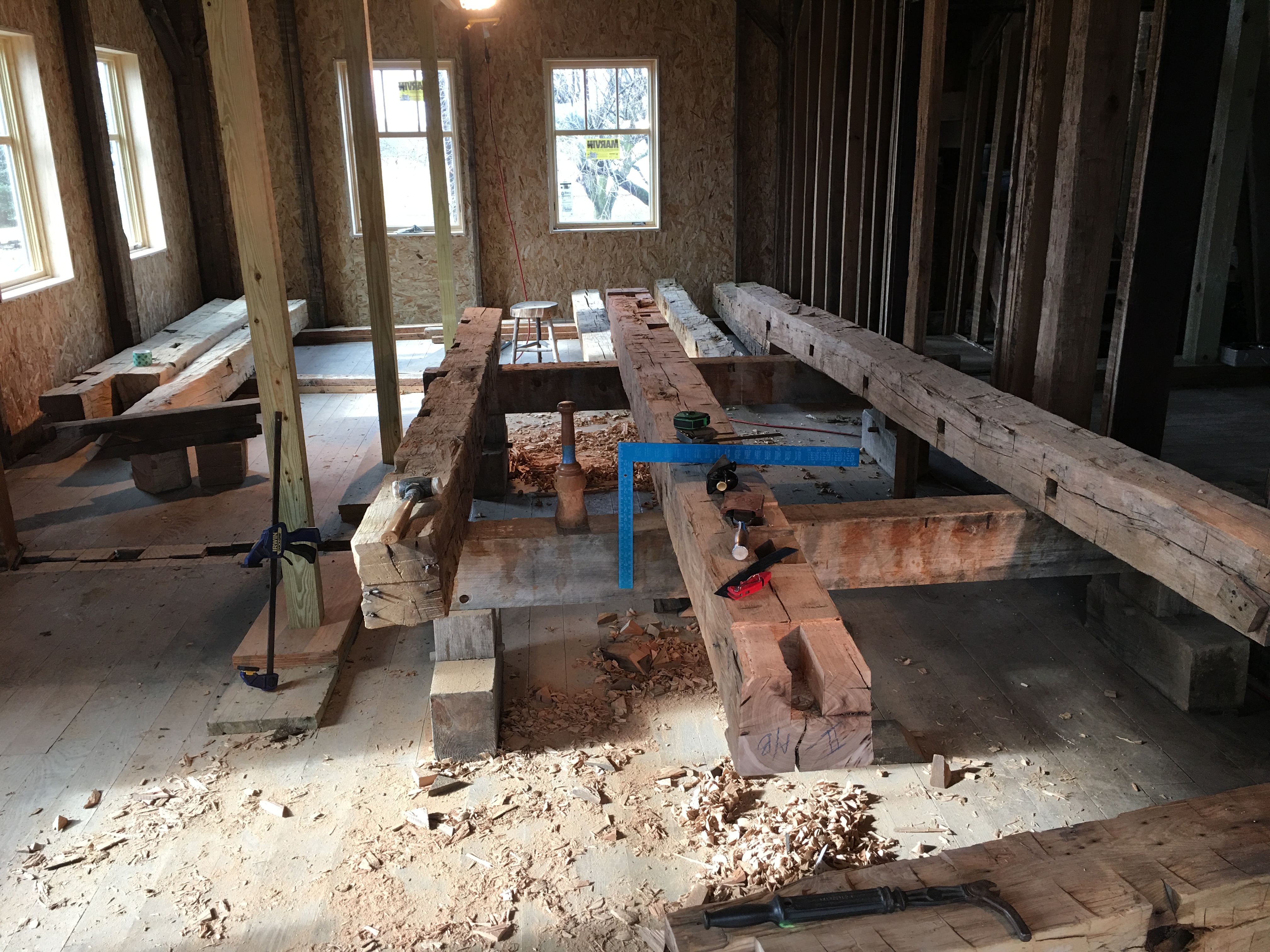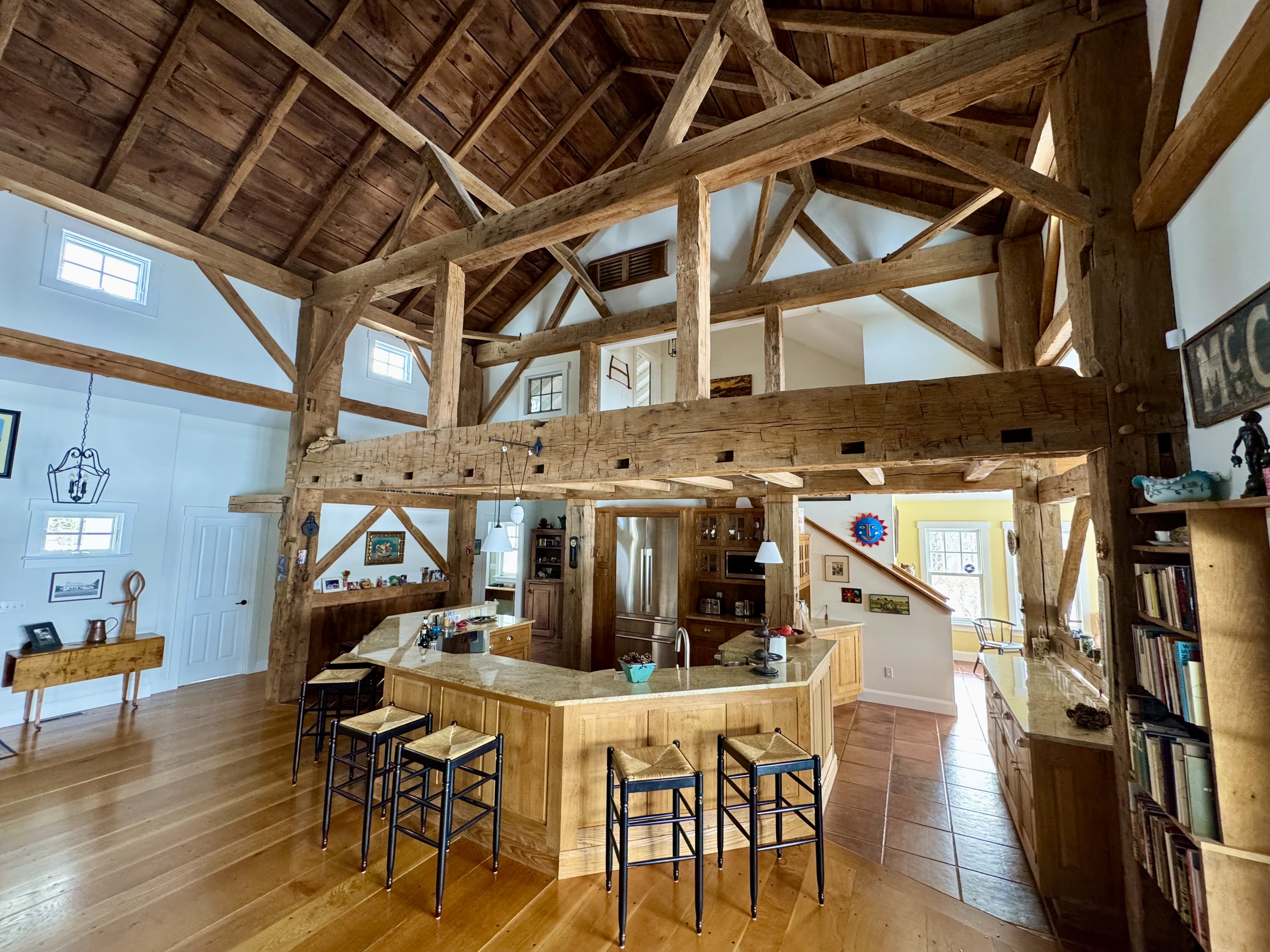 First visit to the family’s 1872 farmhouse in Marion. Having been in the family for generations the new owners, upon learning that the home was timber framed, wished to restore it for their growing family. The house was jacked up and a new concrete foundation replaced the old stone walls. Everything was striped down to the original frame which was then thoroughly cleaned. SIPS (Structural Insulated Panels) were applied to the exterior followed by a complete renovation of the homes interior.