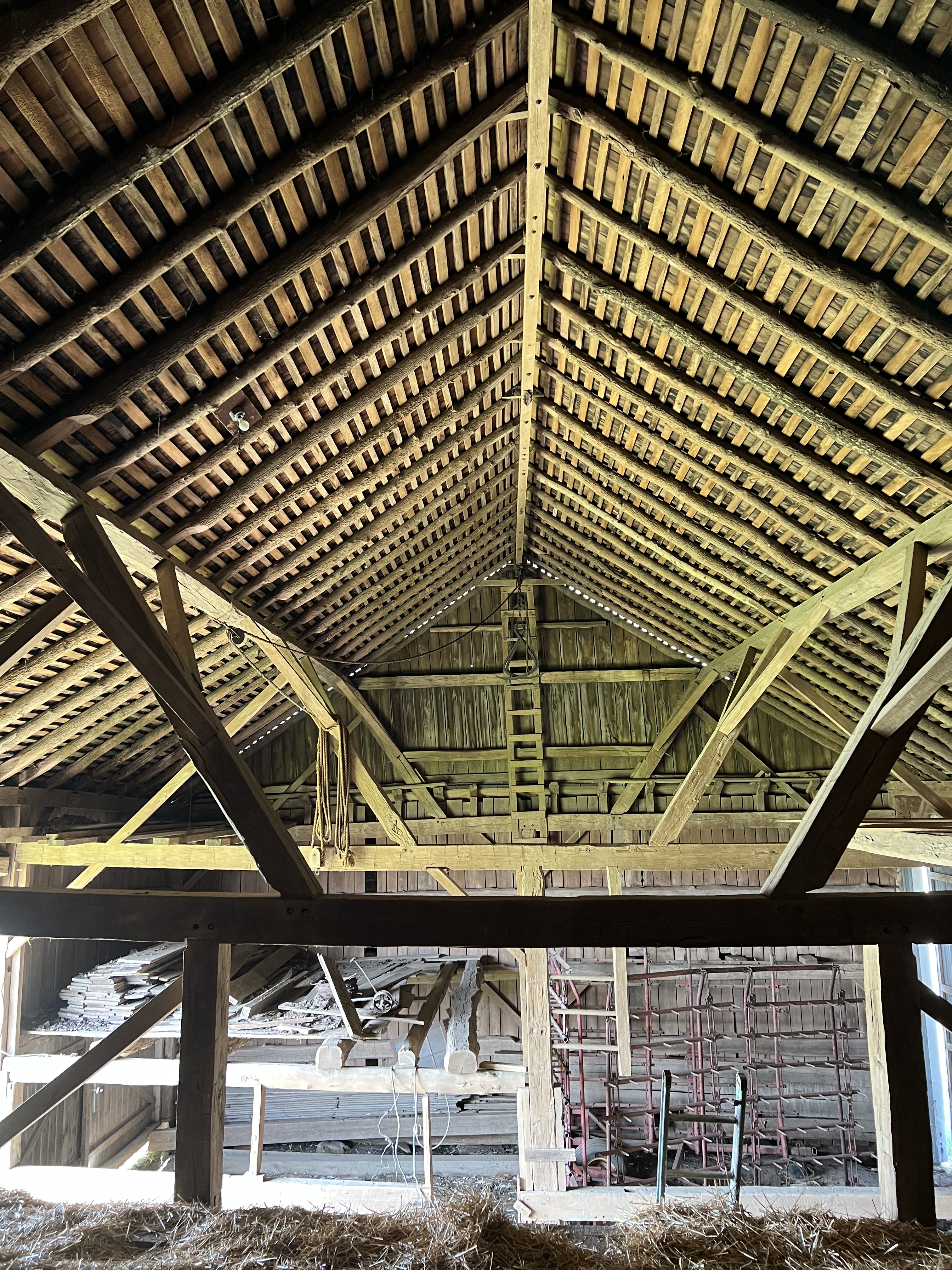 Pole rafters with the bark still on them are spaced unusually close at 24″ on center. The original white oak shingles are intact and the wooden hay track and its trolley car and hay forks which were added in the late 1880’s are in mint condition.